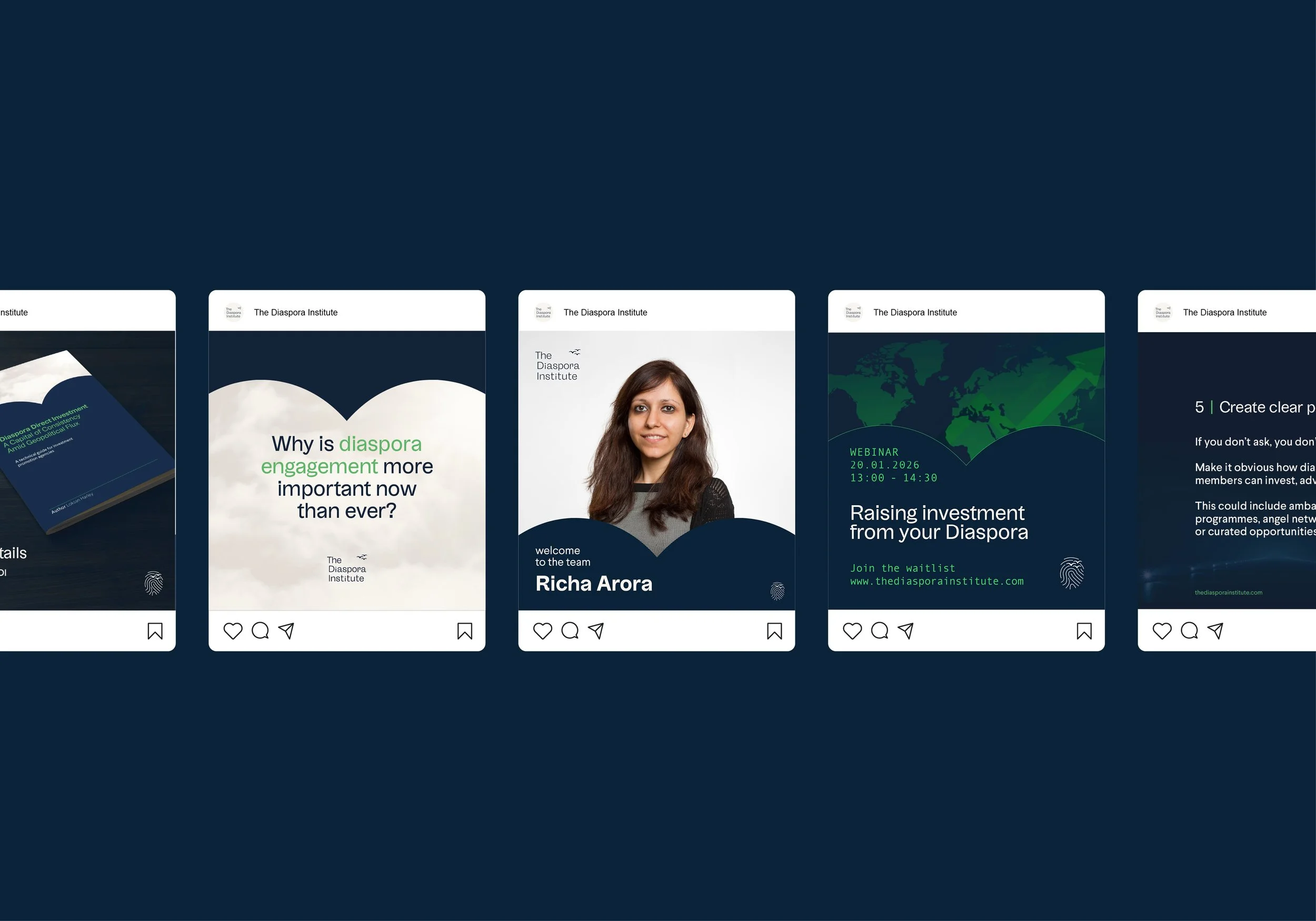 2025The identity for The Diaspora Institute explores the idea of borderless belonging — reflecting the experience of people who leave one place yet remain connected through shared heritage and identity. A fingerprint motif sits at the heart of the design, symbolising the deeply personal nature of diaspora. Within it, subtle references to migratory birds evoke themes of movement, connection and return, linking the symbol with the typographic identity and extending into animation. The visual language balances warmth and emotion with a sense of institutional trust, creating an elegant identity suited to both human-centred storytelling and the policy environments in which the Institute operates.