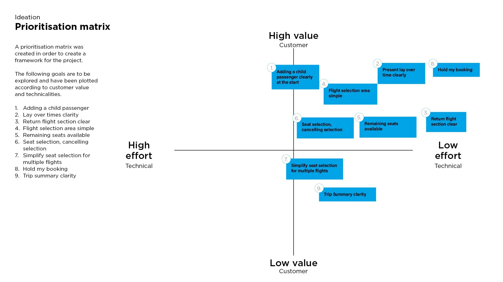 To frame the design challenges for my project, I produced a How Might We, Affinity diagram. I also plotted goals to be explored based on the following customer value and technicalities.